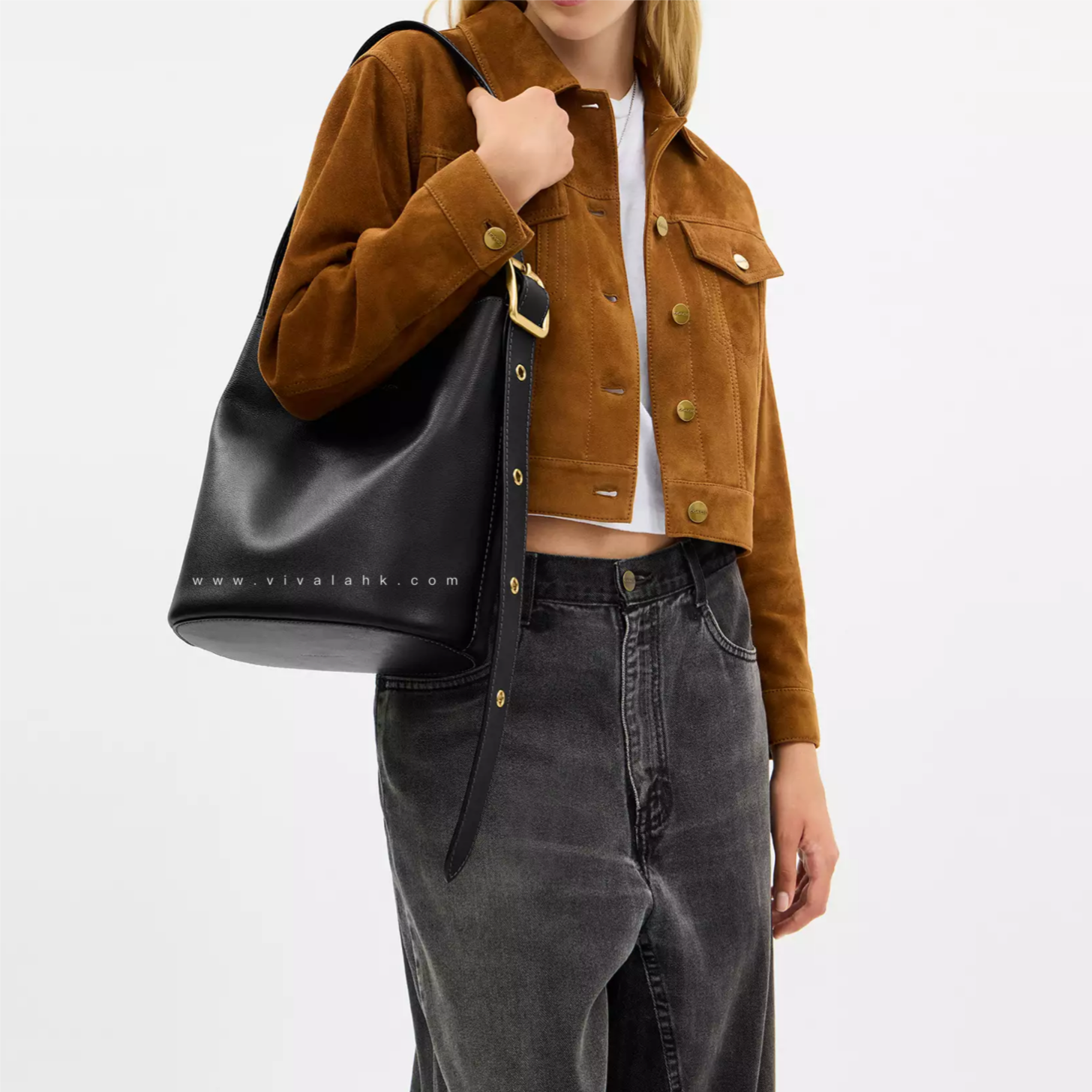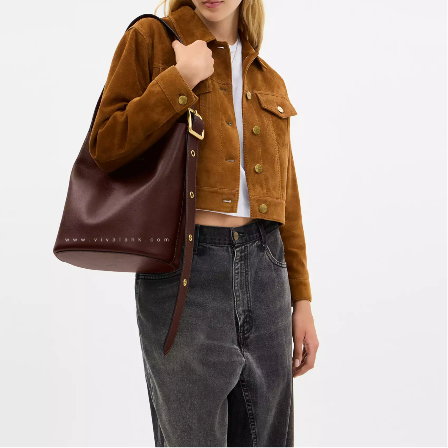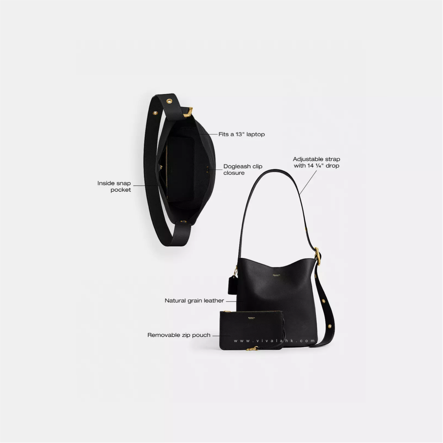 成個袋用上 Coach 招牌 Natural Grain Leather,手感超靚又夠挺,望落即刻有高級質感✨。袋型係自然垂墜嘅水桶形,低調又時尚,返工、上堂、約會都啱晒!