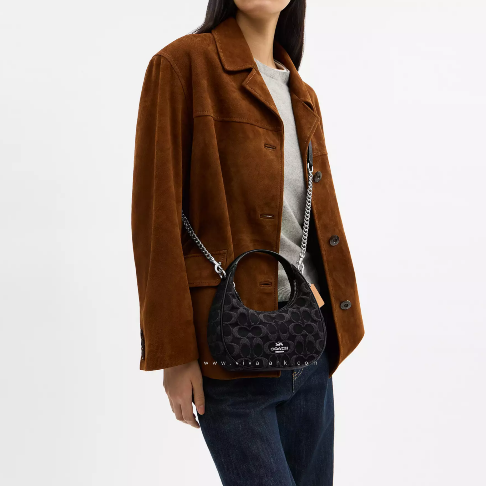Coach 呢款 Carmen Mini Crossbody Bag(CCZ47) 走低調型格路線,採用 Signature 黑色 Denim 布料,配搭黑色皮革邊位同銀色金屬鏈帶,成個感覺又酷又精緻,日常背完全唔浮誇 🖤