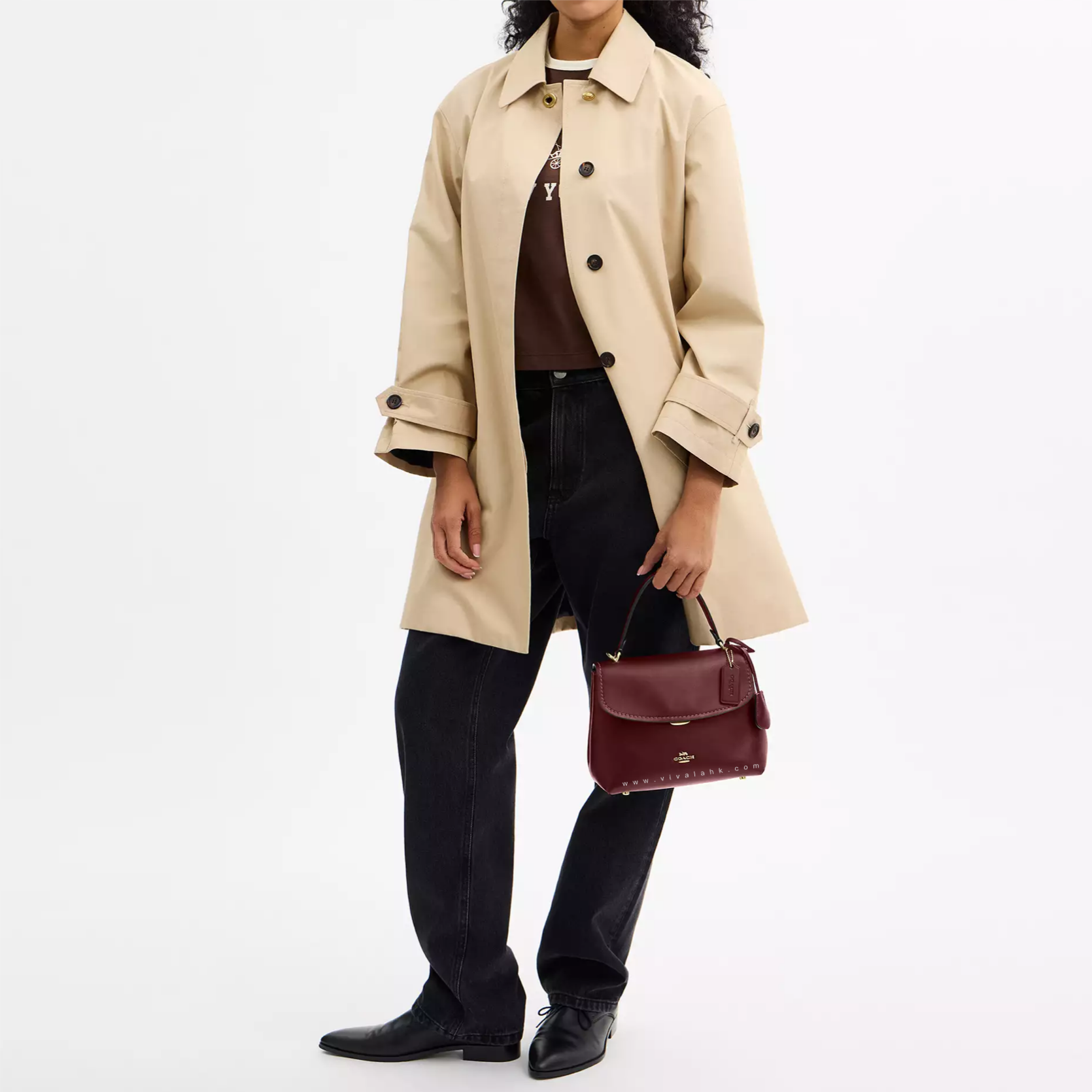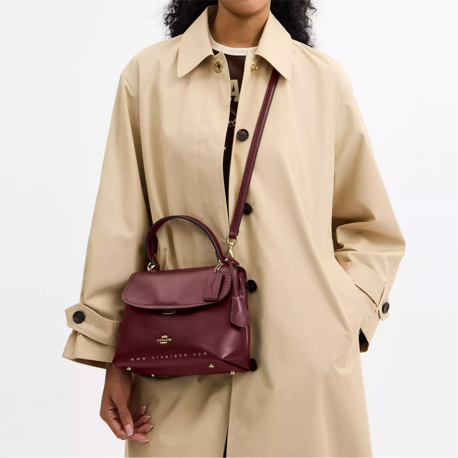 袋身採用 高級光滑皮革(Smooth Leather) 打造,酒紅色調成熟又顯白,配搭金色 Coach 經典旋鎖,復古得嚟又唔老氣,日常拎出街都好有質感 🍷🤎