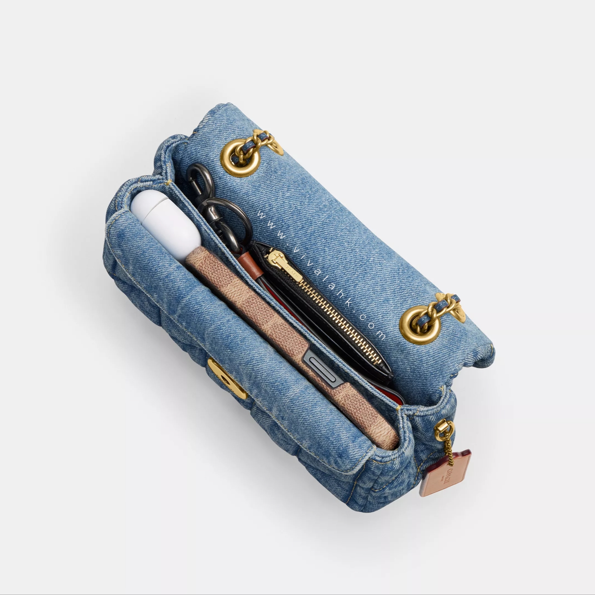 Coach Tabby Shoulder Bag 20 採用 柔軟牛仔布 Quilted Denim 設計,帶來 復古與時尚 的完美結合!金色鏈條肩帶 + Coach C logo 鎖扣 低調奢華,加上 軟墊菱格縫線,充滿高級感✨ 內部 小巧但實用,可收納手機、卡片、鑰匙等日常用品。無論 斜揹 / 側揹,都可以輕鬆駕馭,適合各種場合💖