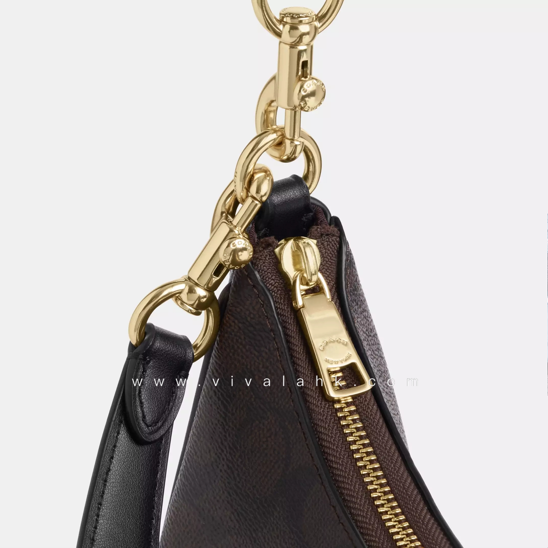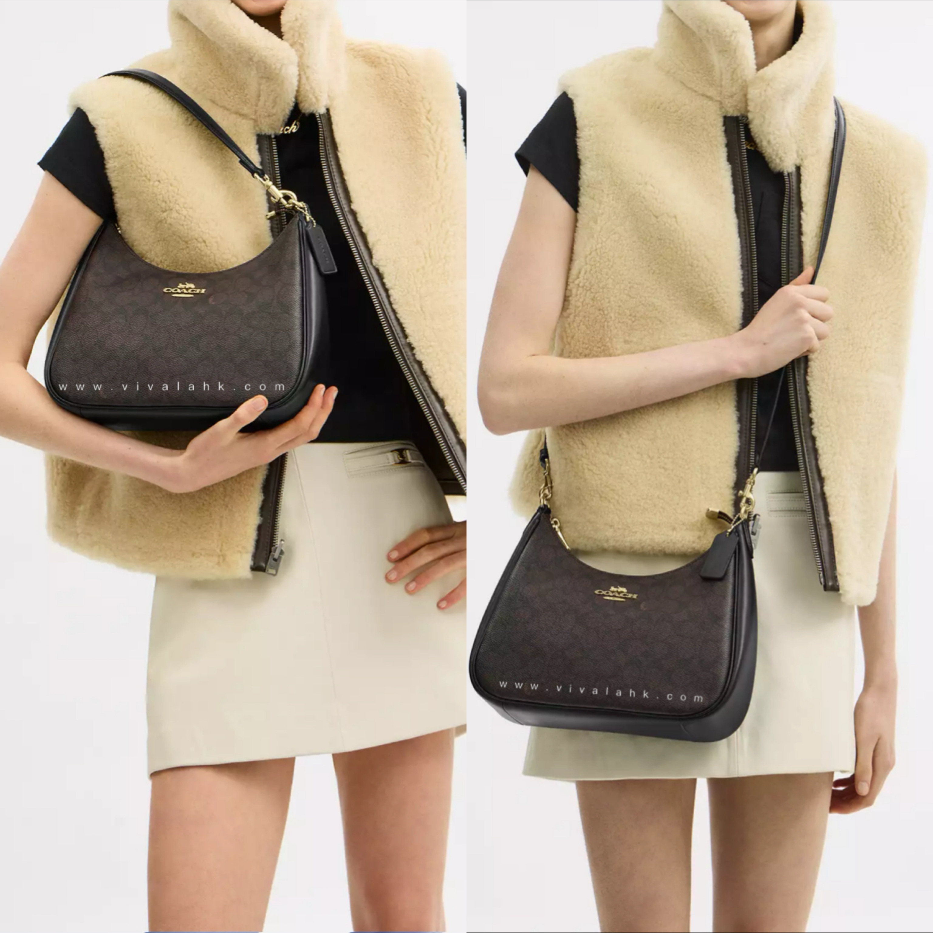 呢款 Coach Teri Hobo Bag 用上經典 Signature Canvas 配搭滑面皮革,標誌性 “C” monogram 圖案盡顯品牌復古味道。金色五金點綴加上流線型彎月袋身,無論單肩揹定斜揹都一樣時尚有型。內部容量充足,日常必需品都放得落,輕鬆兼顧實用同美觀。