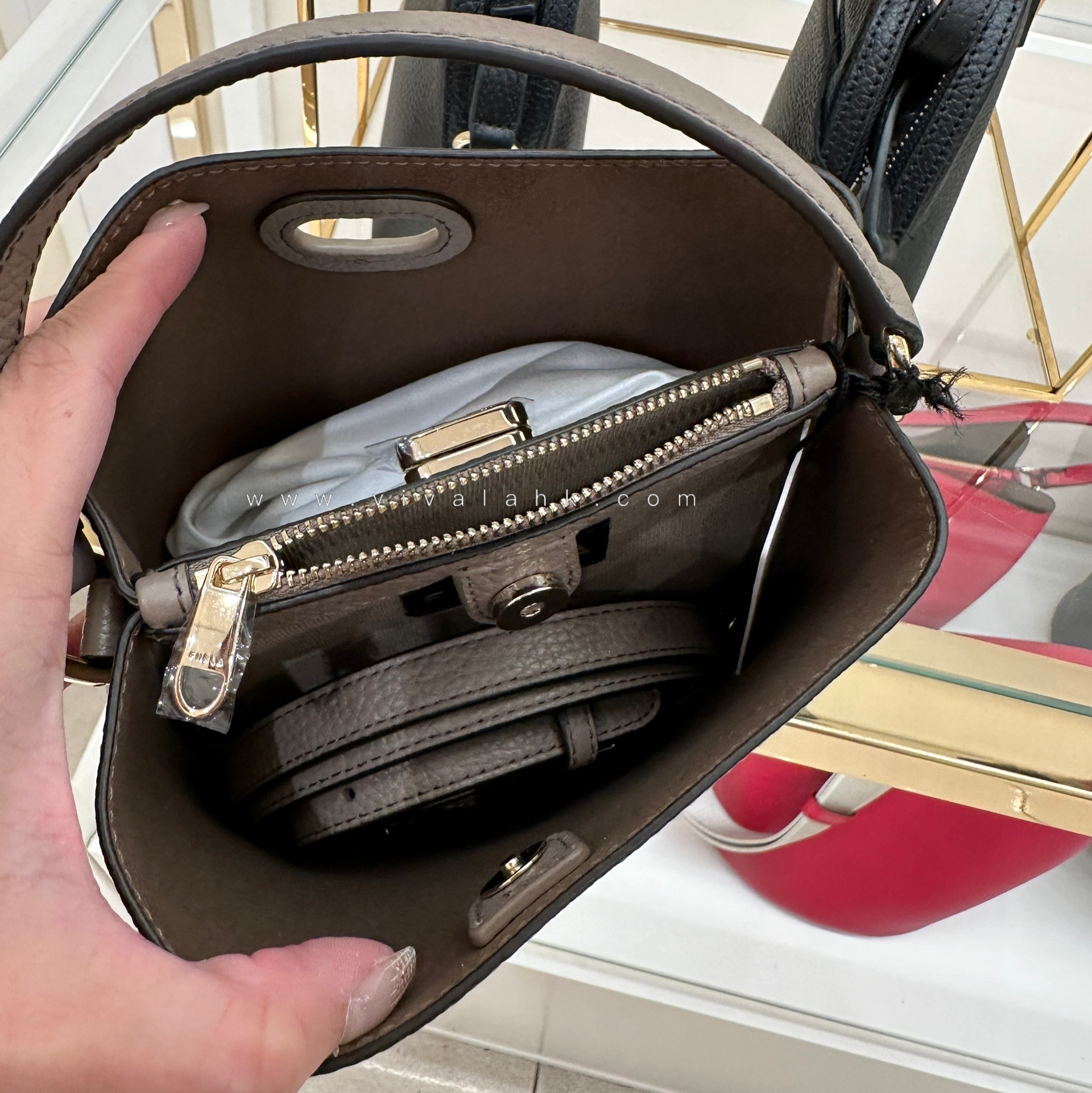 Furla Danae 小型水桶包,採用優質粒紋皮革製成,設有可調節及可拆式肩帶,既可手提亦可側背,靈活搭配各種風格。優雅四葉草金屬扣環設計,簡約時尚,適合日常使用。