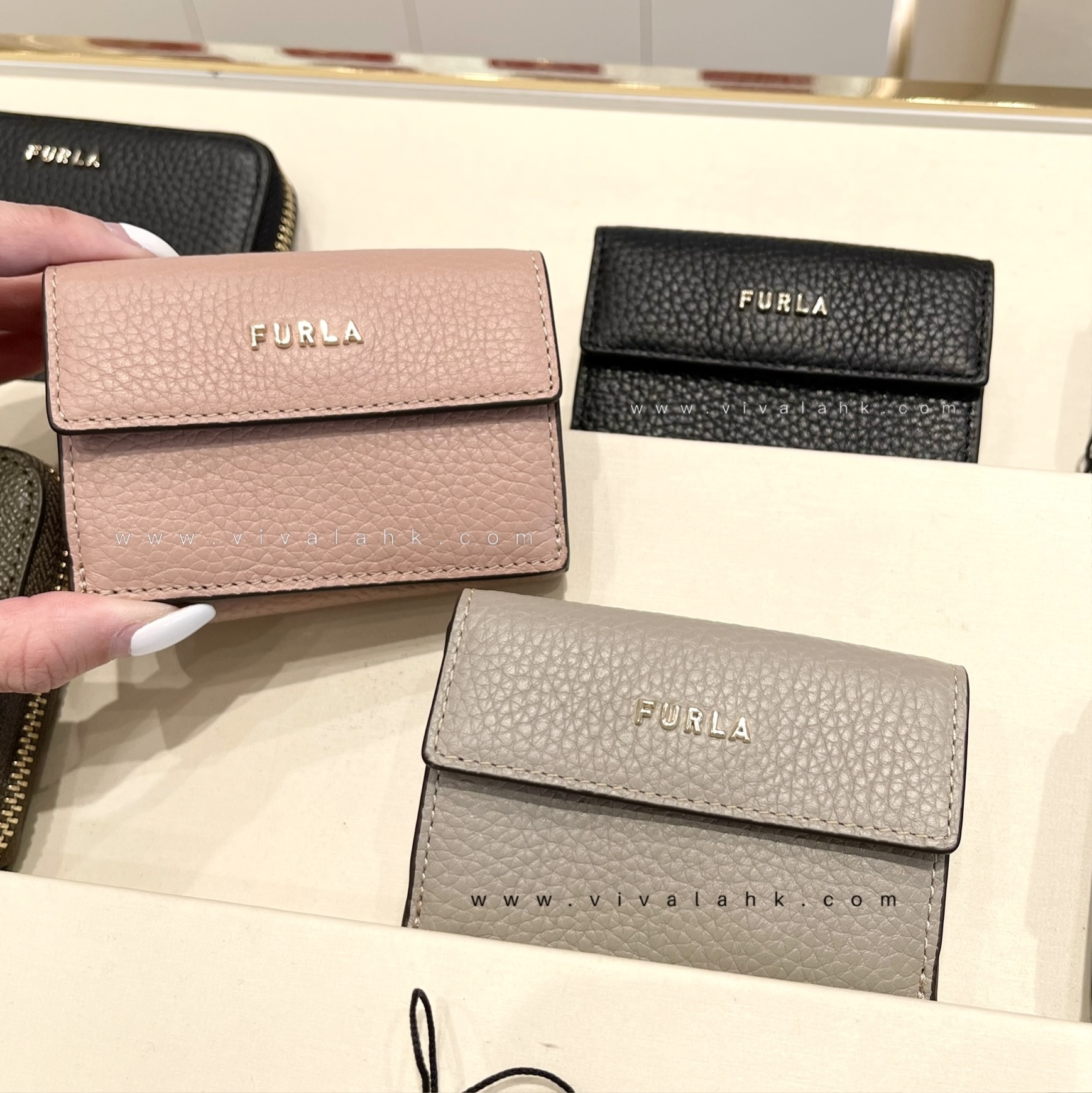 Furla 經典三摺迷你銀包,細細個但夠晒型格!優質壓紋皮革製成,內有卡位、紙幣夾同按鈕零錢格,實用又易用。三摺設計小巧又方便,啱晒放入細手袋!