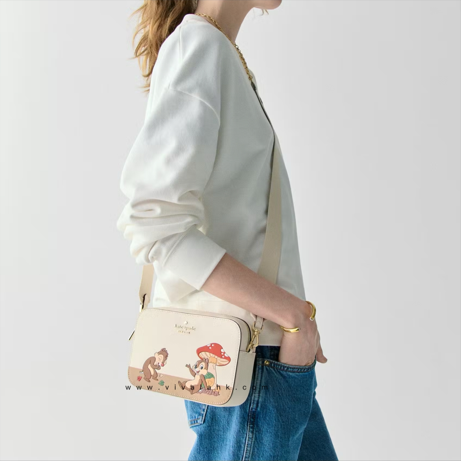 呢款 Kate Spade 聯乘 Disney 嘅 Chip ’n Dale Mini Camera Bag 真係萌到入心!🥰 奶油米色底配上經典迪士尼花栗鼠兄弟花花圖案,俾人一種清新又活潑嘅感覺💐。袋身細細個但容量啱啱好,唔單止可愛仲非常實用,日常出街、旅行或者去迪士尼打卡都一流📸✨。