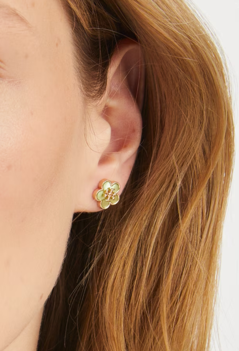 呢款 Tory Burch Kira 花花耳環 真係超靚!🌸 配上珍珠母光澤面,仲加埋招牌 Double T logo,成個設計超有少女感又唔失優雅感。金色邊框襯托出高級感,戴上耳仔即刻幫你氣質大提升~💖 無論返工定約會,絕對係每日百搭之選!