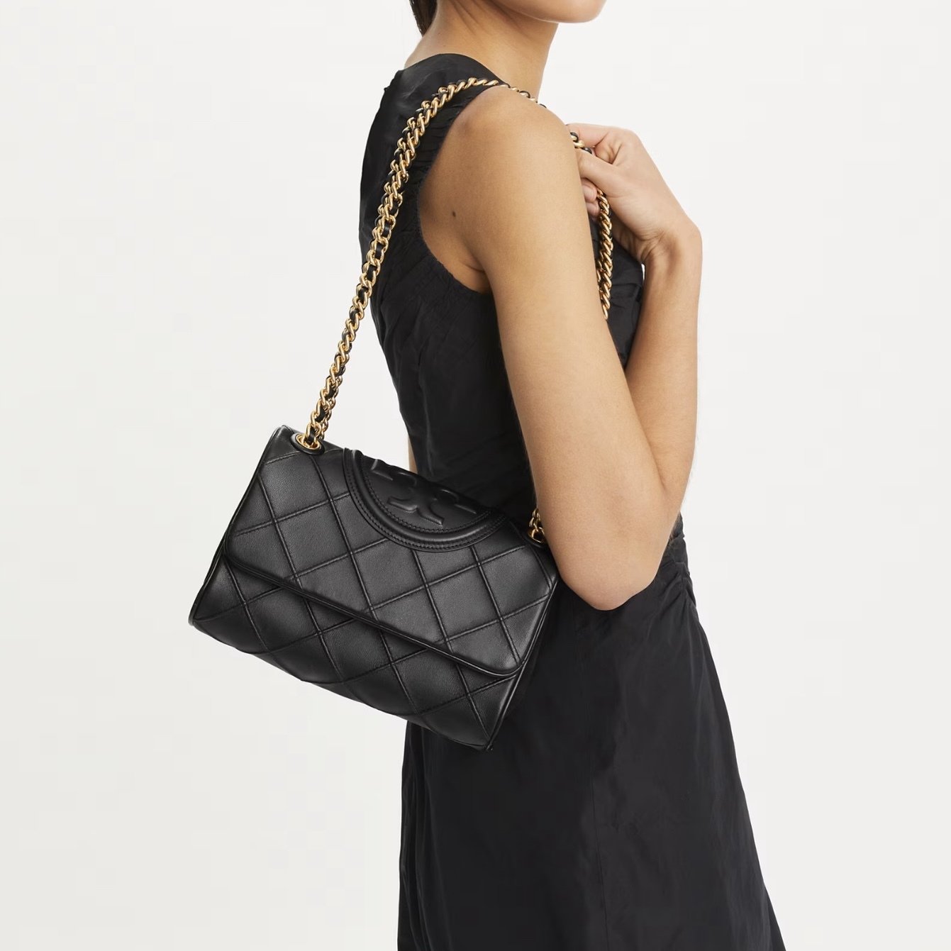 呢款 Tory Burch Small Fleming Soft Shoulder Bag 真係超有氣質 💎!用上柔軟皮革拼咗菱格設計,再配上閃閃嘅金色鏈帶,無論係出街 shopping 定係去高級場合,都勁有型 ✨。Size 啱啱好,裝得落電話、銀包同小物,實用又高貴。