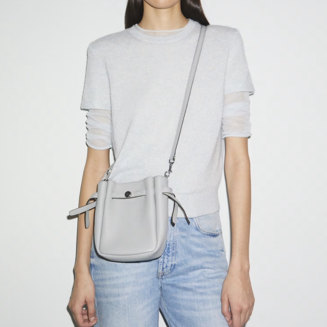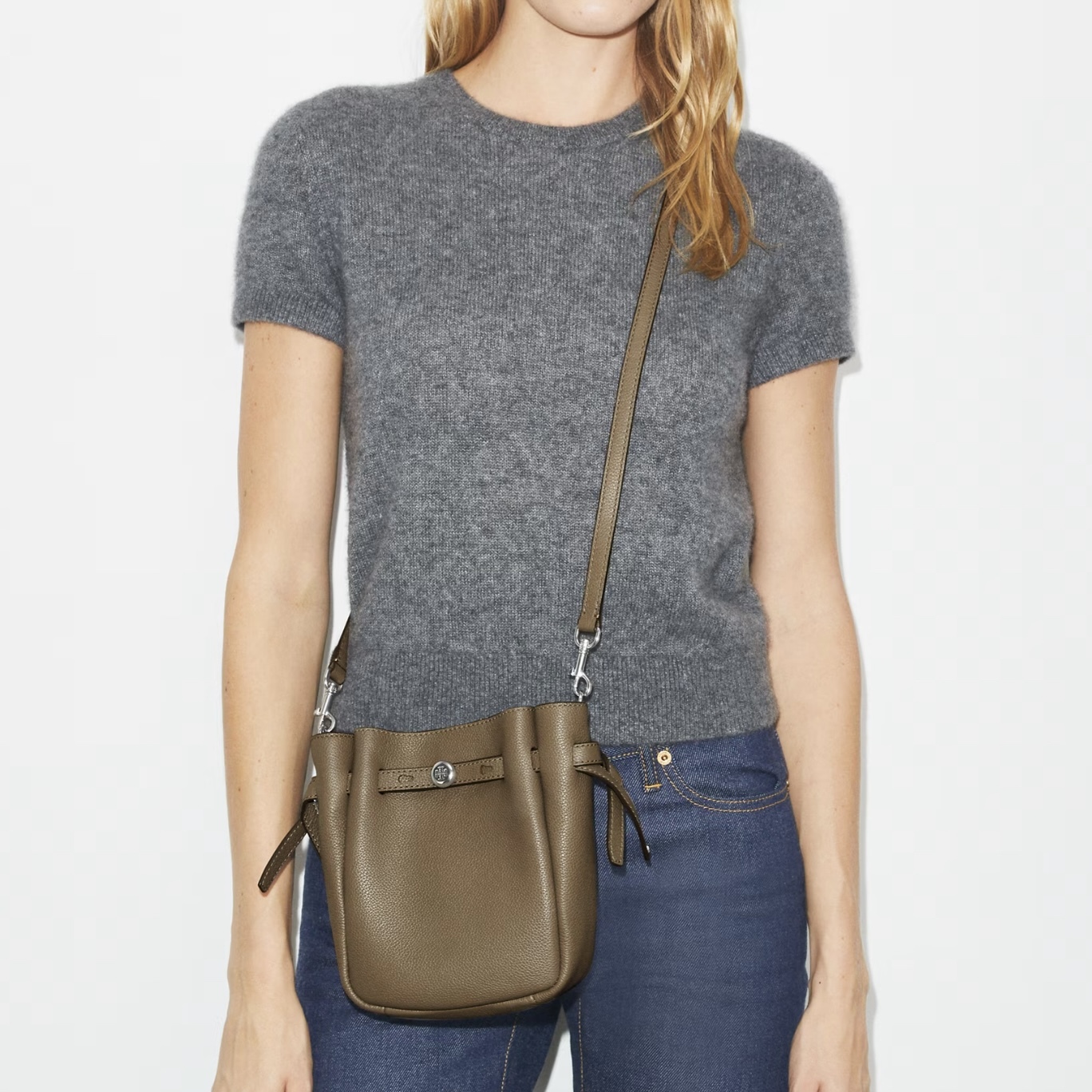 呢款 Tory Burch Small Romy Crossbody 真係日常出街恩物 💕,用咗柔軟嘅粒面皮革,手感一流 🖤。細細個水桶包設計又實用又有型,仲有品牌經典嘅金屬旋鈕點綴✨。無論斜揹定側揹都超方便,容量啱啱好,可以放電話、銀包、卡套同啲小雜物。