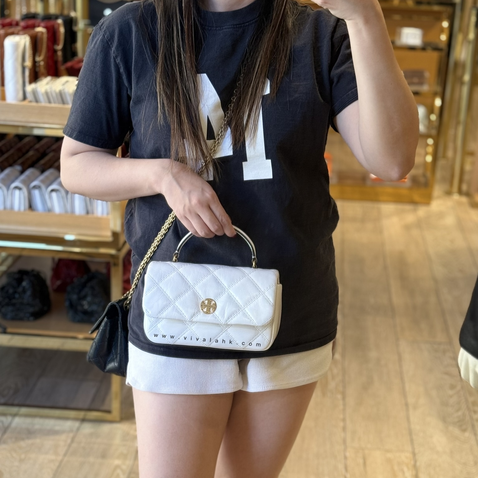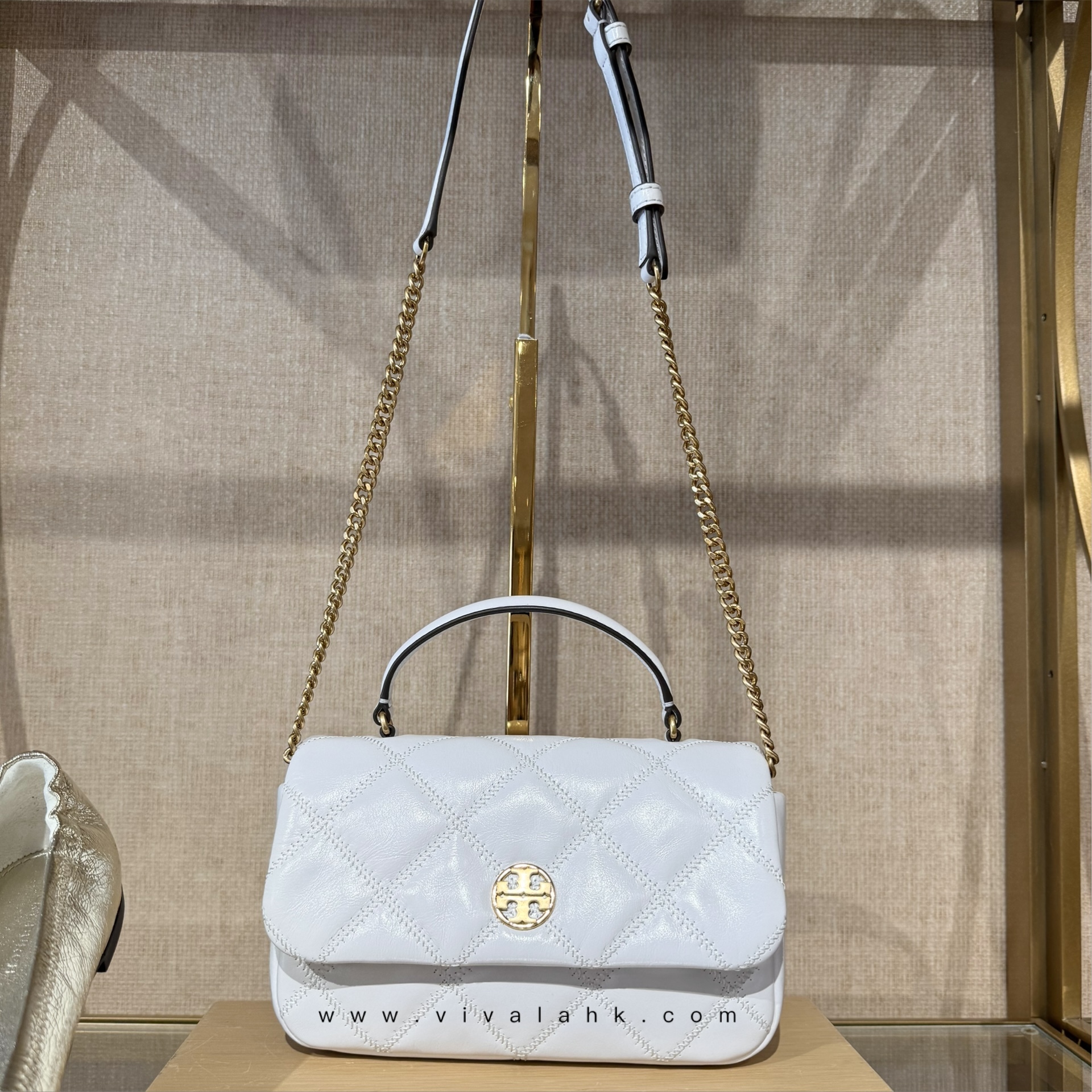 白色亮面菱格皮革配搭金色 TB 圓形 Logo,氣質感超強,乾淨、優雅又百搭,完全係「斯文名媛 feel」代表。